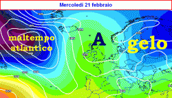 giovedì 22 febbraio: fase fredda sull’Italia, specie al nord e in Adriatico, qualche debole nevicata lungo la dorsale appenninica.