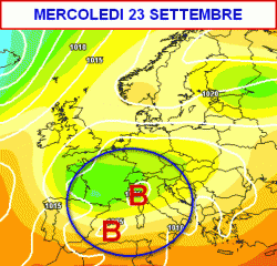 Lo vediamo raffigurato nella cartina di previsione valida per la giornata di mercoledì 23 settembre. Come si può notare, il Bacino del Mediterraneo sarà avvolto da una vasta struttura depressionaria con due distinti minimi: il primo in prossimità del Mar Ligure, il secondo sulle Baleari.