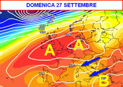 Il passo successivo sarà una lenta evoluzione a levante della struttura depressionaria sotto la spinta (per altro poco convinta) dell’anticiclone delle Azzorre visibile sulla sinistra della seconda foto (valida per domenica 27).