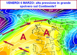 La seconda cartina, valida per la giornata di venerdì 6 marzo, ci mostra una situazione di stabilità sia in Italia che su gran parte d’Europa. Sarà l’inizio di un periodo anticiclonico più lungo? A giudicare dalle carte, la figura stabilizzante potrebbe essere insidiata ancora una volta da correnti settentrionali fredde sul suo fianco destro, ma al momento è davvero presto per parlarne.