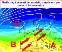 La media degli scenari del modello americano valida per venerdì 24 novembre (prima mappa), mostra un’alta pressione schiacciata verso il Mediterraneo orientale e le regioni meridionali italiche.