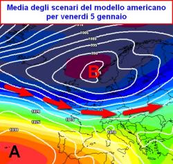Attorno alla giornata dell’Epifania, il getto atlantico dovrebbe rallentare. Ciò determinerà maggiori ondulazioni della corrente medesima che ospiterà una vasta saccatura sull’Europa centro-occidentale e sul Mediterraneo (seconda mappa).