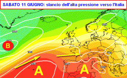Il secondo fine settimana di giugno (la prima mappa ci mostra la situazione attesa per sabato 11 giugno) dovrebbe trascorrere con tempo soleggiato e stabile dalle Alpi alla Sicilia.