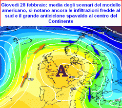 Secondo la media degli scenari del modello americano davvero poco. Continueranno i disturbi lungo le regioni adriatiche con infiltrazioni di aria fredda che potranno dar luogo a qualche sporadico fenomeno al sud e sull’Abruzzo ma nulla di più sino ai primi giorni di marzo.