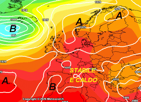 Ad una prima occhiata sembra che alla stabilità atmosferica si affianchino temperature non troppo elevate; in altre parole, non si dovrebbero raggiungere sull’Italia i picchi termici che stiamo affrontando in queste ultime giornate.
