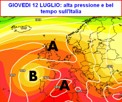 La prima mappa, valida per giovedì 12 luglio, mostra il dominio indiscusso del bel tempo sull’Italia; le temperature saranno ovviamente elevate, ma non da record stante la presenza di aria relativamente più fresca che scorrerà sulla Penisola Balcanica.