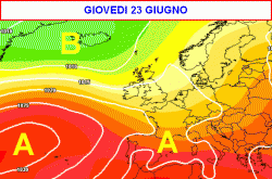 La mappa relativa alla giornata di giovedì 23 giugno ci mostra una situazione molto comune nell’ultima decade del mese di giugno: alta pressione delle Azzorre che si protende con il suo braccio a proteggere l’Italia e il Mediterraneo da ulteriori attacchi instabili.