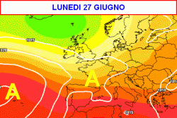 La seconda mappa, valida per lunedì 27 giugno, ci mostra ancora il nord Italia lambito da un po’ di instabilità, mentre il centro, il sud e le Isole resteranno sotto il sole pieno unitamente a temperature a connotazione estiva.