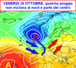 La prima mappa, relativa alla giornata di venerdì 20 ottobre, mostra l’ingerenza di una moderata perturbazione al nord e sulla Toscana. Non arriveranno le piogge estese e democratiche, ma qualche rovescio dovrebbe essere garantito, nel letto delle correnti dominanti di matrice occidentale (quindi umide, ma non fredde).
