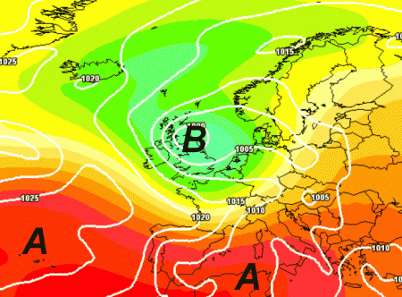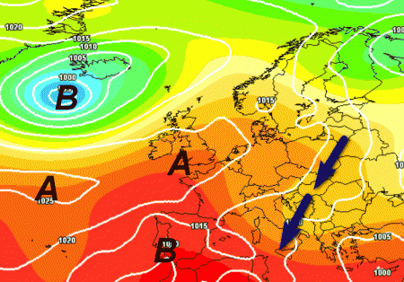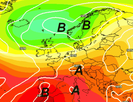 L’alta pressione delle Azzorre resterà un po’ defilata ad ovest; sul suo fianco orientale scenderanno correnti più fresche da nord-est che imporranno un po’ di instabilità sull’Italia, specie al centro e al meridione, con alcuni temporali essenzialmente pomeridiani.