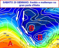 Osservate la prima mappa che mostra la situazione prevista per sabato 20 gennaio. L’Italia verrebbe avvolta dalle spire di una intensa depressione con elevato rischio di nevicate a bassa quota specie sulle regioni centrali.