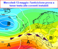 mercoledì 13 maggio: moderata protezione dell’anticiclone che assicurerà bel tempo, nonostante il passaggio di corpi nuvolosi sfrangiati da nord-ovest, con associati locali rovesci sul basso Adriatico e nelle zone interne appenniniche del versante adriatico del centro. Temperature miti.