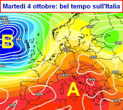 La prima mappa si riferisce alla giornata di martedì 4 ottobre. Come vedete, non resterà quasi nulla del peggioramento che avverrà tre giorni prima. L’alta pressione sarà di nuovo in sella, pronta a portare nuovamente stabilità e bel tempo sulla nostra Penisola fino al secondo week-end mensile.