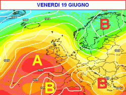 L’analisi prevista per venerdì 19 giugno ci mostra un’alta pressione delle Azzorre sufficientemente pavoneggiata, ma troppo sbilanciata verso nord-ovest per consentire un’adeguata protezione alla nostra Penisola.