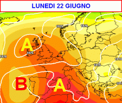 Una maggiore (ma temporanea) stabilizzazione delle condizioni meteo, unita ovviamente ad un aumento delle temperature massime, la avremo tra domenica 21 e martedì 23 giugno. Dalla cartina, valida per la giornata di lunedì 22 giugno, si nota la rimonta di una zona anticiclonica di matrice africana atta a scongiurare in maniera più decisa la formazione di eventi temporaleschi in Italia.