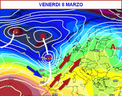 Volgendo lo sguardo oltre, fino a venerdi 8 marzo (seconda mappa) la situazione potrebbe riproporre altre perturbazioni da ovest in perfetto stile primaverile.