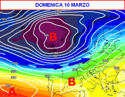 Le prospettive di una prima decade marzolina decisamente dinamica, mite ed a tratti anche piovosa, ci giunge inoltre dalla mappa estrapolata dal modello americano per domenica 10 marzo (terza cartina).