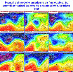 Il modello americano si sta trascinando dietro anche gli altri modelli, con la sua ostinazione nel veder prevalere le correnti da ovest sull’Europa per gli ultimi giorni di ottobre, anche se il Mediterraneo centrale, cioè l’Italia, alla fine risulterebbe spesso protetta dalla cintura degli anticicloni subtropicali, sperimentando un tempo nel complesso mite e tranquillo, dopo una breve fase perturbata tra il 27 ed il 29.
