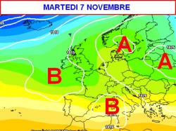 Volgendo lo sguardo a prua e arrivando alla giornata di martedì 7 novembre (seconda mappa), sembra scavarsi un canale depressionario con asse Isole Britanniche-Francia-Bacino centro-occidentale del Mediterraneo.