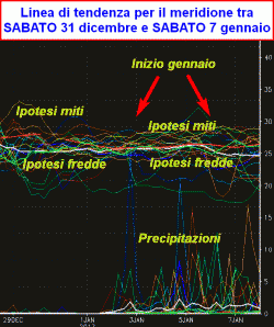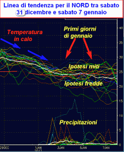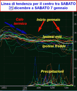 In questa sede analizzeremo la linea di tendenza meteorologica tra sabato 31 dicembre e sabato 7 gennaio al nord, al centro e al sud con l’ausilio di un grafico ormai noto.