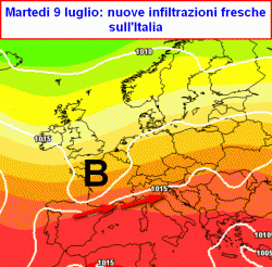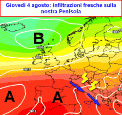 Quanto durerà questa situazione? Sul finire della prima decade di agosto si manifesterà probabilmente un nuovo cedimento dell’alta pressione sulle regioni centro-settentrionali (terza mappa).