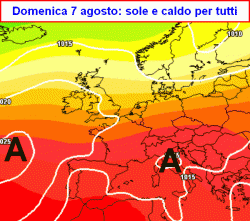 La seconda mappa, relativa alla giornata di domenica 7 agosto, ci mostra una situazione completamente stabile sull’Italia, dalle Alpi alla Sicilia.