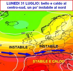 A seguire, a partire da venerdì 28 luglio fino alla fine del mese (la terza mappa si riferisce alla giornata di lunedì 31 luglio), il tempo dovrebbe rimettersi al centro, al sud e sulle Isole, dove si apprezzerà anche un aumento delle temperature.