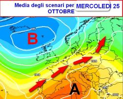 La natura proverà a far cambiare le cose in seguito, ovvero verso fine mese; la prima mappa è la media degli scenari del modello americano valida per mercoledì 25 ottobre.