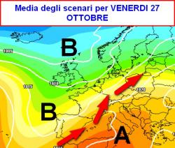 La media degli scenari del modello americano prevista per venerdì 27 ottobre mostra le regioni settentrionali e la Toscana abbracciate da un mite e umido respiro piovoso; il resto d’Italia resterà protetto da una zona anticiclonica che consentirà un ampio soleggiamento e temperature (guarda caso) superiori ai valori medi del periodo.