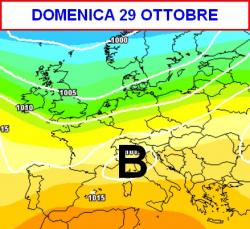 Arrivando all’ultimo fine settimana di ottobre (la terza mappa mostra la situazione attesa in Italia nella giornata di domenica 29 ottobre), la nostra Penisola potrebbe essere abbracciata dalla pioggia, stante la formazione di una depressione sui bacini centro-settentrionali italiani.