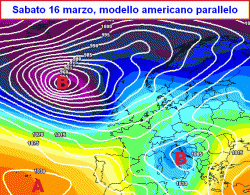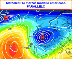 La prima mappa è l’analisi proposta questo pomeriggio dal modello americano parallelo per la giornata di mercoledi 13 marzo; si nota un poderoso blocco circolatorio in Atlantico e la discesa di una depressione fredda di matrice artica che potrebbe interessare anche l’Italia, segnatamente i settori centro-settentrionali del Paese.