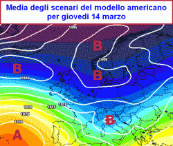 La terza mappa mostra infine la media degli scenari del modello americano valida per giovedi 14 marzo.