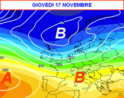 La media degli scenari contemplata dal modello americano per giovedì 17 novembre mostra l’affondo di una saccatura sul nord Italia, foriera di piogge sparse e nevicate sulle Alpi anche se a quote piuttosto elevate.