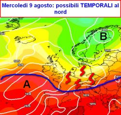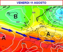 Tra mercoledì 9 e venerdì 11 agosto le regioni settentrionali risentiranno di aria meno calda in arrivo dall’oceano (frecce blu), unitamente a qualche temporale che dalle Alpi potrebbe sconfinare anche in pianura.