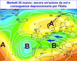 Infatti un ponte anticiclonico Azzorre-Scandinavia ha solitamente due punti deboli: o si rompe in mezzo o sul lato termico più orientale dello scandinavo: nel primo caso ne deriva un altro marcato affondo freddo da nord, nel secondo una reiterazione delle condizioni depressionari con contributi freddi da est.