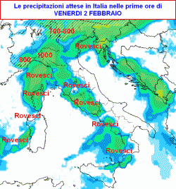 Venerdì 2 febbraio maltempo al centro, sul nord-est e sul meridione con rovesci e temporali sparsi. Migliora al nord-ovest, ventoso, ma non freddo.