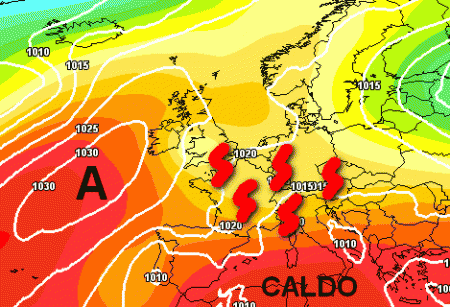 L’insidia all’alta pressione è rappresentata dalla goccia fredda presente sulla Francia. Il suo movimento verso levante (freccia blu) insidierà la struttura stabilizzante ad iniziare dal nord con una progressiva accentuazione dell’attività temporalesca nei giorni successivi.