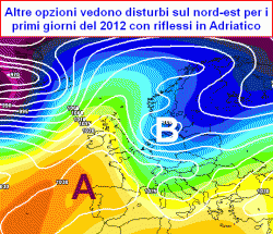 Un lieve cedimento di questo spugnone, potrebbe consentire il passaggio di perturbazioni lungo la cresta di confine alpina centro-orientale da fine anno o dai primi del 2012 con possibili riflessi anche in Adriatico, per il resto l’alta pressione opporrà ancora una discreta resistenza. Comunque una certa ondulazione delle correnti atlantiche, per quanto un po’ collocate mediamente troppo a nord, potrebbe favorire qualche afflusso freddo in Adriatico entro l’Epifania, ma qui andiamo nel difficile, meglio non proseguire su questa tortuosa strada.