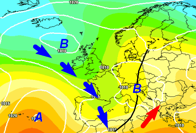 Notiamo l’alta pressione che si manterrà lontana dalla scena italica e mediterranea. Notiamo inoltre l’aria fredda di matrice nord atlantica (frecce blu) che si tufferà sul bacino occidentale del Mediterraneo formando un’attiva depressione al cui interno sarà presente il sistema frontale suddetto. Una situazione di questo tipo non potrà che determinare molta instabilità in Italia, con elevato rischio di pioggia su molte regioni.
