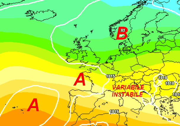L’alta pressione raggiungerà con un lembo la Francia occidentale, ma non l’Italia, dove il tempo seguiterà a mostrare carattere di estrema variabilità che a tratti potrebbe sfociare in instabilità come ad esempio nelle aree interne del centro e su alcuni settori del nord. In altre parole avremo schiarite anche ampie, ma alternate a qualche rovescio o temporale, sotto l’egida di temperature tutto sommato gradevoli.