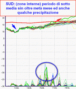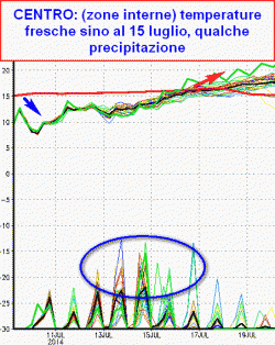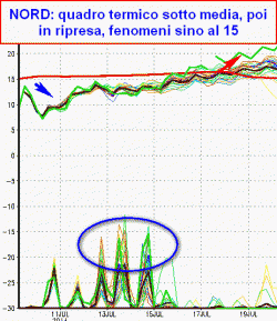 Le carte spaghetti che postiamo qui di fianco riassumono la situazione su tutta Italia nel periodo compreso tra il 10 ed il 20 luglio e vi illustrano chiaramente la ripresa delle temperature a 1500m soprattutto da martedì 15 un po’ su tutto il Paese. Non si vede comunque nessuno sconfinamento oltre l’isoterma dei +20°C.