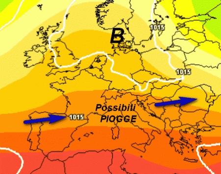 E’ innegabile come l’alta pressione venga progressivamente limata dalle correnti occidentali (frecce blu) che oltre a far calare le temperature, saranno artefici di alcune precipitazioni che in una fase iniziale interesseranno il nord e parte delle regioni centrali.
