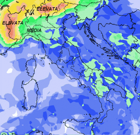 Una probabilità di pioggia elevata sarà di competenza di Alpi e Prealpi. Sul resto del nord e nelle aree interne del centro-sud la medesima probabilità viene al momento giudicata media, fino a bassa sul resto della Penisola dove vedete il colore blu.