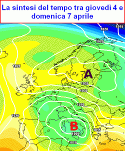 Nel corso della prima decade di aprile, la presenza dell’anticiclone russo-scandinavo e di una massa d’aria ancora molto fredda sul settore centro-settentrionale del Continente, chiuderebbe la porta al normale transito delle perturbazioni sul nord Europa, deviandole verso sud e cioè verso il bacino centrale del Mediterraneo.