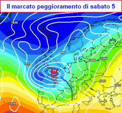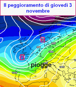 Una saccatura più robusta dovrebbe fare il suo ingresso nel Mediterraneo intorno a sabato 5 novembre, finendo per coinvolgere tutto il Paese e con alte probabilità che si vada isolando una depressione nell’area mediterranea.