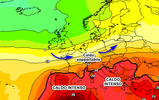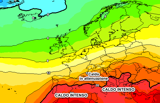 La linea nera sancisce il confine tra caldo intenso e più sopportabile. Notate come tutta l’Italia centro-meridionale sarà alle prese con caldo intenso a cui si assocerà una quasi completa assenza di fenomeni. Il settentrione invece potrà godere di un clima maggiormente sopportabile, indotto anche dai temporali presenti in loco.