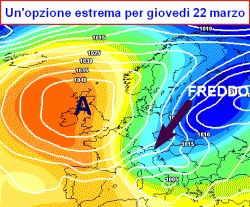 Lì basterebbe un lieve sbilanciamento del "bestione" verso nord per vederci piombare addosso nuclei freddi in grado di attivare forti condizioni di instabilità, vista ormai anche la rinnovata attività cumuliforme, facilitata da un più generoso soleggiamento. Naturalmente ancora una volta le regioni più penalizzate da questo tipo di circolazione risulterebbero quelle adriatiche e meridionali, con cali termici anche repentini, temporali e ritorni di neve improvvisi in Appennino.