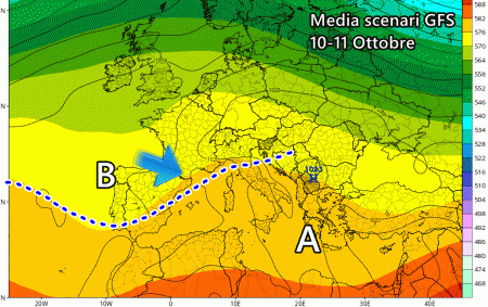 Sia la media degli scenari del modello europeo (mappa qui sopra) che del modello americano (mappa sotto),  intravedono una potenziale regressione dell’anticiclone sull’Europa occidentale. Con questo arretramento dell’anticiclone su questa parte del continente, è probabile che le perturbazioni atlantiche possano raggiungere più facilmente il Mediterraneo occidentale e parte dell’Italia. Le regioni del nord e quelle sul versante tirrenico sarebbero le più esposte all’umidità proveniente da ovest e, di conseguenza, alle piogge e ad eventuali fenomeni intensi.
