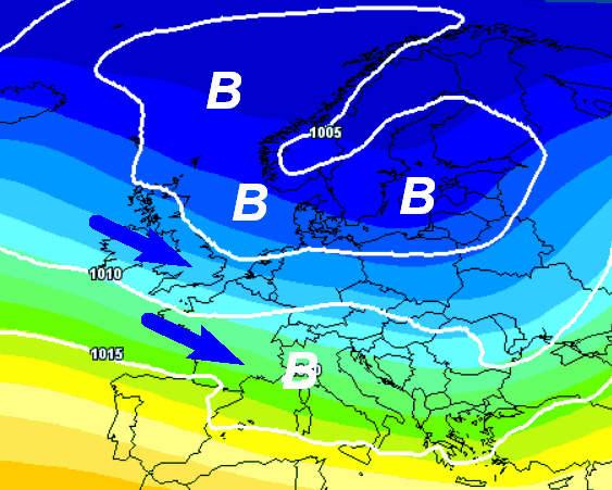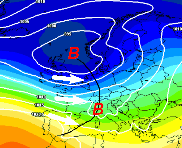 L’elaborato mostra il transito di una perturbazione piuttosto intensa che formerebbe una depressione tra il Mar Ligure e il settentrione italiano. Inutile dire che con questa situazione il tempo sarebbe perturbato su gran parte della nostra Penisola, con un occhio di maggior riguardo alle regioni settentrionali ed il versante tirrenico.