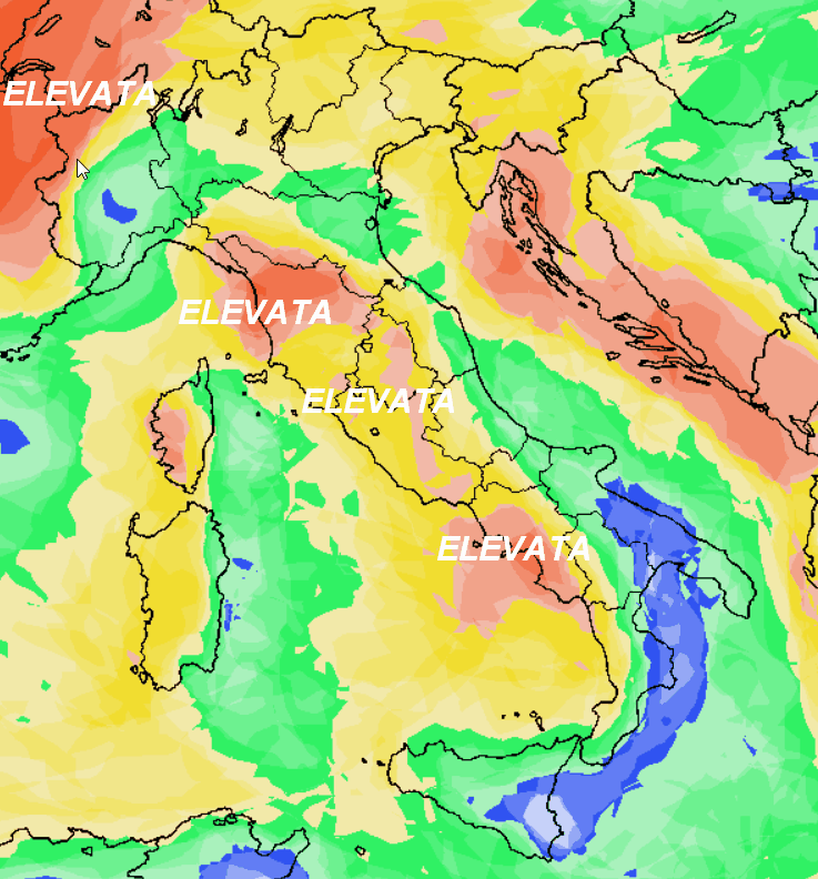 Alcune zone del settentrione e del versante tirrenico potrebbero avere una probabilità di pioggia elevata (colore rosso), ma come vedete le precipitazioni saranno estese a quasi tutta la nostra Penisola con una probabilità media. Solo le estreme regioni meridionali potrebbero avere una probabilità di pioggia bassa.